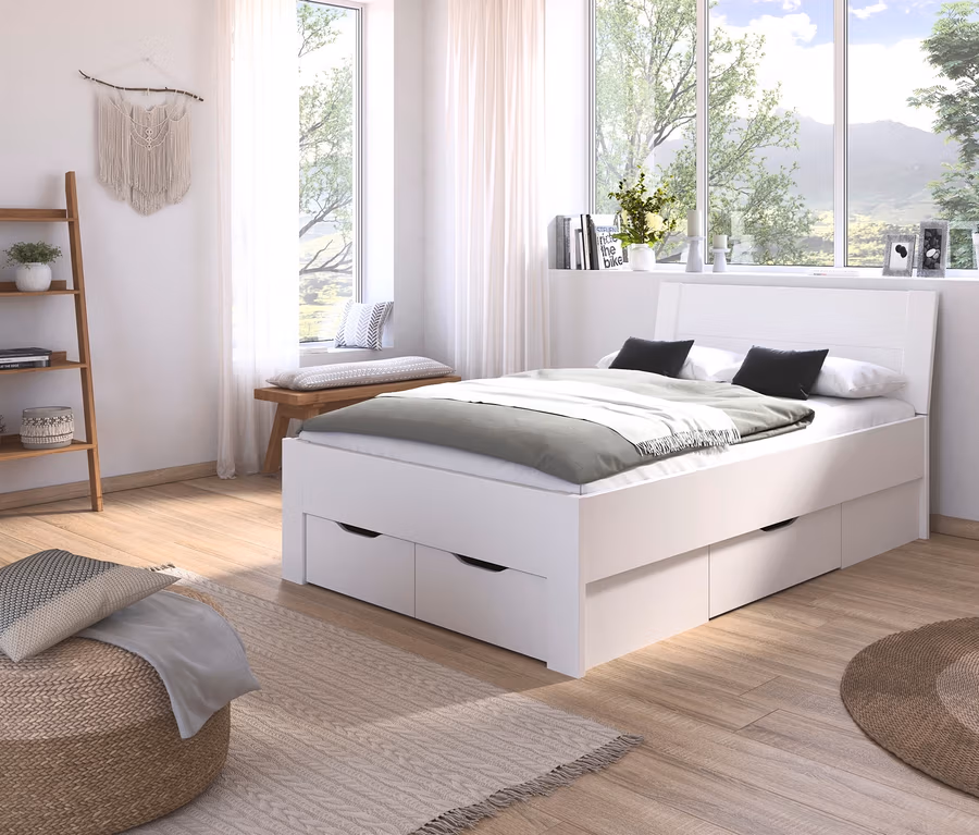 - Stauraumbett in modernem Weiß mit Schubladen unter dem Bett