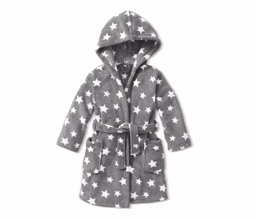 Nicht nur der schicke Sternen-Alloverprint macht diesen Bademantel zum echten Star. Vor allem seine kuschelig weiche Plüschqualität lässt die Herzen kleiner Wasserratten höherschlagen. Mit seinen cleveren Details wie Gürtel und Kapuze haben kalte Bäuche oder nasse Haare keine Chance. Und in den aufgesetzten Taschen kann man ganz nebenbei auch die Händchen oder ein kleines Spielzeug verstecken.