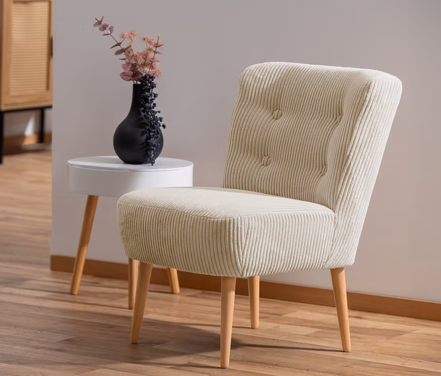 - Der breite, helle Cordstoff harmoniert perfekt mit dem Retro-Style des Sessels