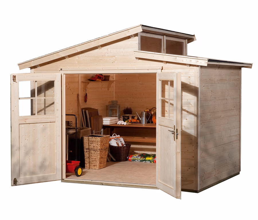 Gartenqualität made in GermanyMit abschließbarer DoppeltürDie WG für Rasenmäher, Grill und Gartenstühle: In diesem Gartenhaus finden die unterschiedlichsten Gartenhelfer ein Zuhause und sind sicher vor der Witterung. Zudem ist das WEKA-Gartenhaus mit seinem versetzten Massivholz-Satteldach und den drei Oberlichtern ein echter Hingucker.