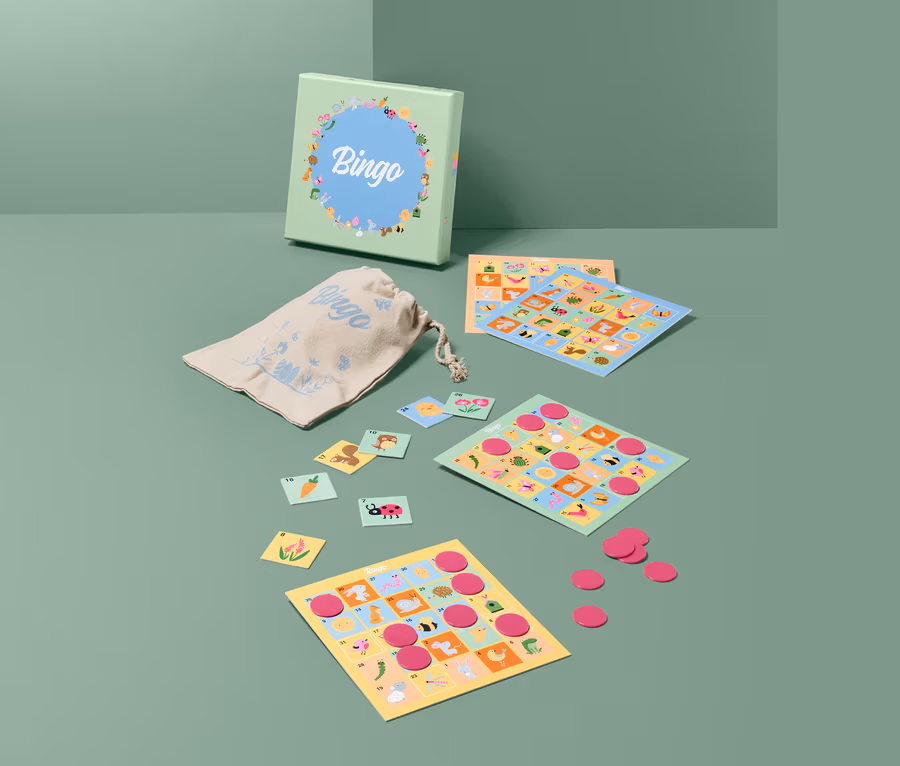 - Inkl. Aufbewahrungsbox, 4 Bingo-Spielbrettern, 1 Baumwoll-Beutel, 100 Spielsteinen, 31 Spielkarten und Spielanleitung