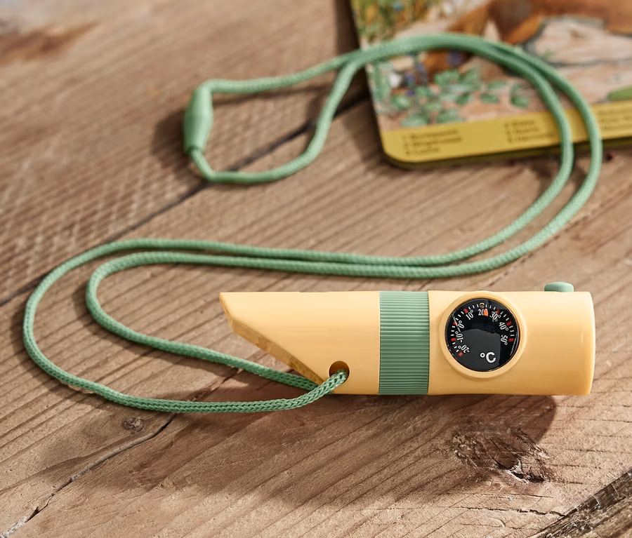 - LED-Taschenlampe, Kompass, Thermometer, Pfeife, Lupe, Spiegel und Mini-Geheimfach