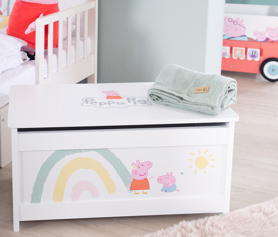 • Truhenbank im Peppa Pig Design zum Aufbewahren von Spielwaren, Büchern und Utensilien – kindgerecte Sitzhöhe von ca. 30 cm