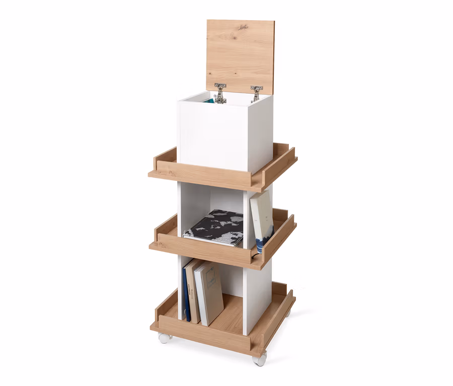 Bücherturm mit Details in Eichendekor