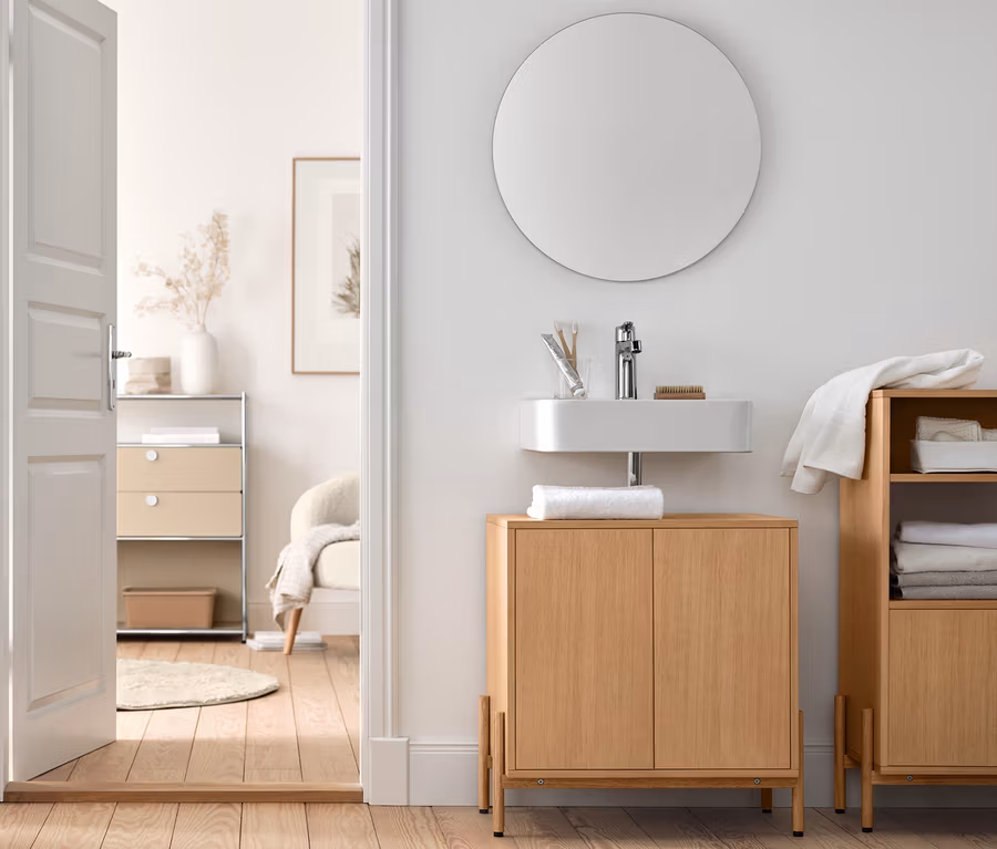 - Badezimmermöbel mit individuell höhenverstellbarem Einlegeboden hinter den Türen