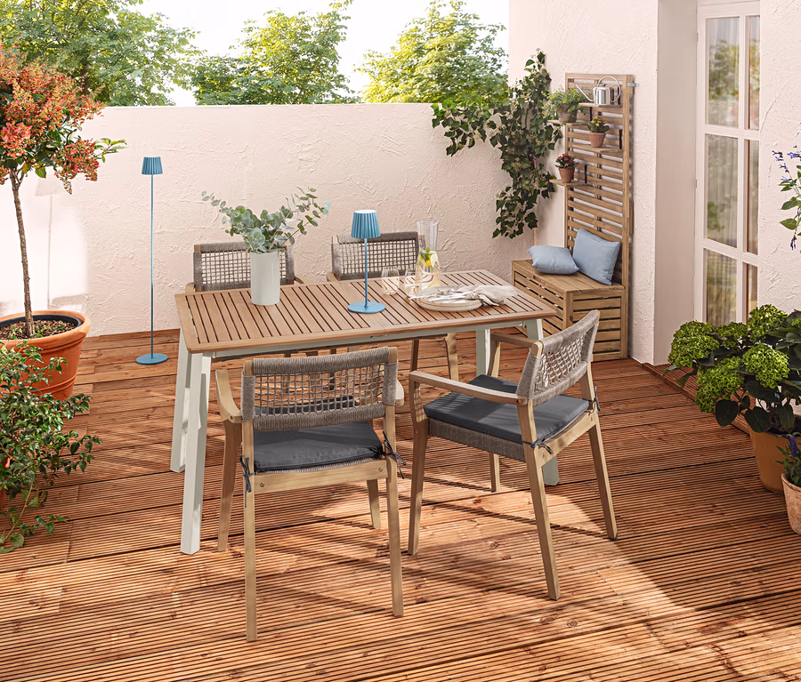 - Tischplatte aus FSC®-zertifiziertem Eukalyptusholz in Teakoptik, lackiert
