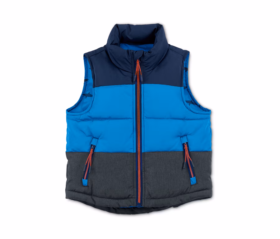 Die Kinderweste liegt mit ihrer weichen, wärmenden Wattierung angenehm am Oberkörper und das Innenfutter hat einen coolen Hai-Alloverprint. Die Weste ist ideal Verbindung mit einem Pullover oder über einer leichten Regenjacke und das beschreibbare Namenslabel verhindert Verwechslungen.