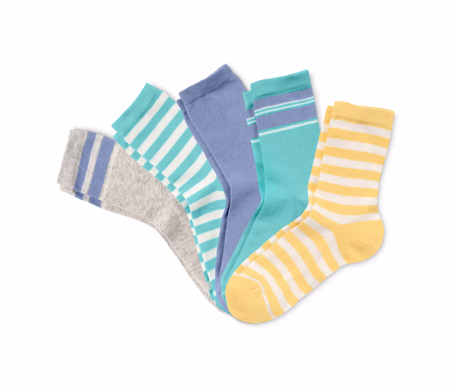 - 1x grau meliert mit mittelblau-weißen Streifen, 1x türkis-weiß gestreift, 1x mittelblau, 1x türkis mit mittelblau-weißen Streifen, 1x gelb-weiß gestreift