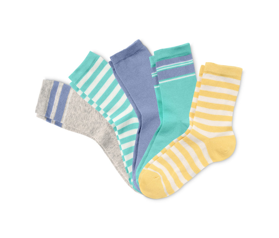 - 1x grau meliert mit mittelblau-weißen Streifen, 1x türkis-weiß gestreift, 1x mittelblau, 1x türkis mit mittelblau-weißen Streifen, 1x gelb-weiß gestreift
