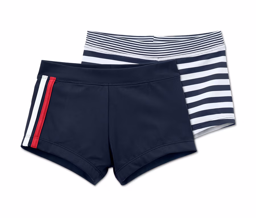 Mit diesen zwei Badehosen können kleine Seeräuber nach Lust und Laune plantschen, schwimmen und spielen. Sie sind ausgesprochen strapazierfähig, trocknen schnell und sind dank Elasthan besonders formbeständig – bei perfektem Sitz und hohem Tragekomfort. Beide Kinder-Schwimmhosen sind vorne unterfüttert und haben einen elastischen Bund, der sie vom Verrutschen abhält. Zusätzlich sorgt die Faser LYCRA® XTRA LIFE™ für die Widerstandskraft gegen Chlor und UV-Strahlen.
