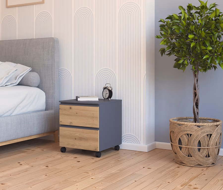 - Moderner Nachttisch als Rollcontainer in Grau Metallic mit Absetzungen in Eichenholzoptik