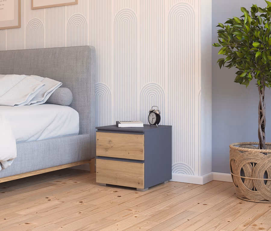 - Moderner Nachttisch in Grau Metallic mit Absetzungen in Eichenholzoptik