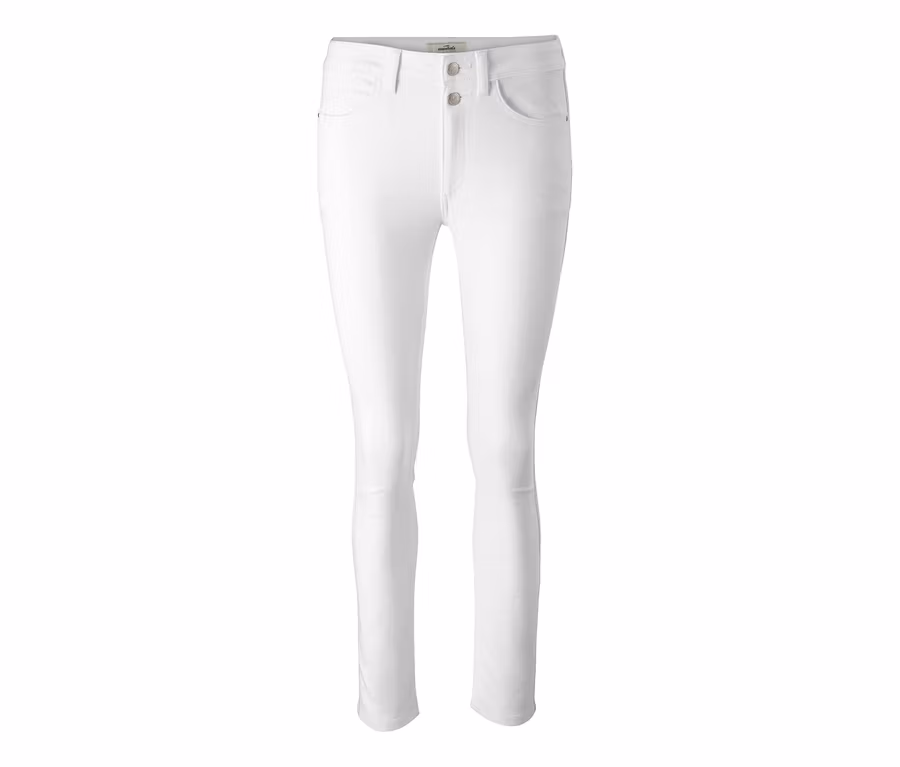 Mit ihrer besonders weichen, elastischen Baumwoll-Mischqualität liegt diese Sweatjeans besonders angenehm auf der Haut, Elasthan sorgt dabei für Formbeständigkeit, einen perfekten Sitz und zusätzlichen Tragekomfort. Die blickdichte Damenhose hat zwei Vordertaschen sowie einen Bund mit Gürtelschlaufen und zwei Knöpfen mit dekorativer Stanzung. An der Seitennaht sorgt Glitzertape für einen elegant-stylischen Look.