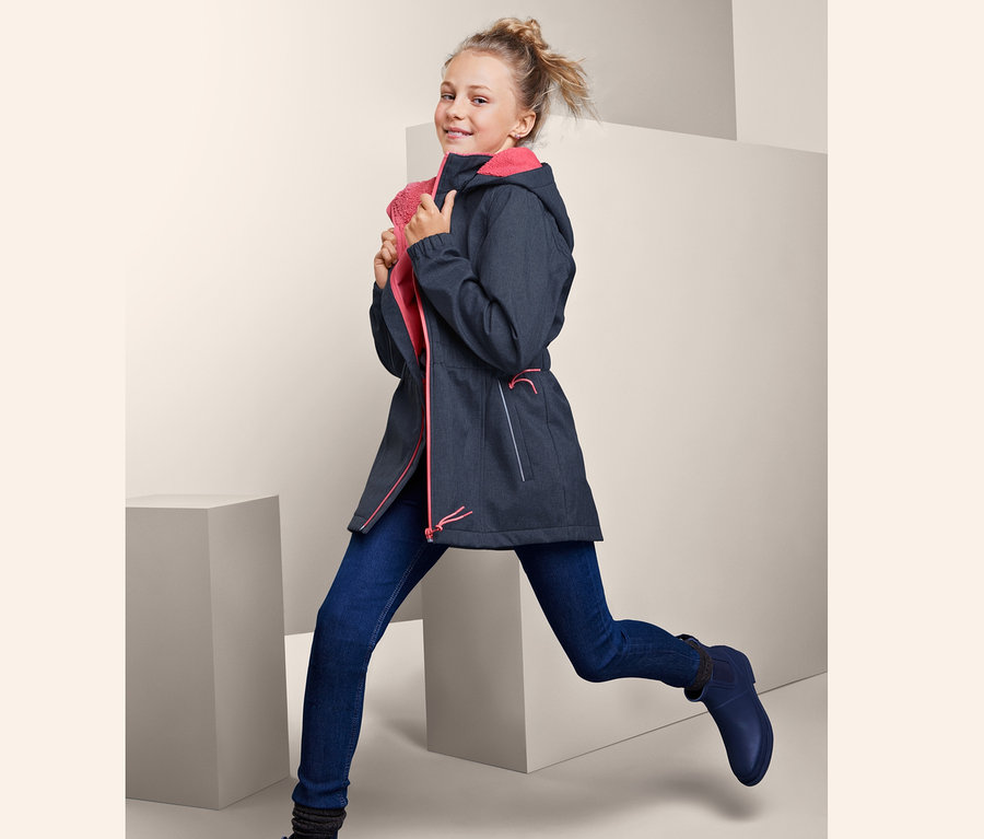 Natürlich punktet die Softshelljacke auch mit hohem Tragekomfort, denn das elastische Obermaterial verspricht optimale Bewegungsfreiheit. Richtig gemütlich macht es zudem das weiche, wärmende Microfleece- kombiniert mit kuscheligem Teddyplüschfutter in Kapuze und Kragen. Die abknöpfbare Kapuze, die zwei Reßverschlusstaschen auf der Vorderseite und die Taille mit Gummizug sind zusätzliche Features, die man bei einer Kinderjacke auf keinen Fall missen möchte.