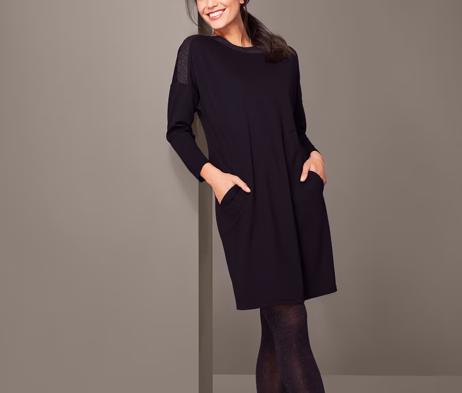Dieses zeitlose Jerseykleid in Schwarz sieht durch seine dekorativen Taillennähte mit Taschen nicht nur gut aus, sondern ist durch den leicht O-förmigen Schnitt auch noch bequem. Ein silberglänzender Einsatz ziert den runden Halsausschnitt des Langarm-Kleides, während die überschnittenen Schultern leger wirken. Aber auch der Tragekomfort stimmt einfach, denn durch das formbeständige Elasthan und die Interlock-Qualität sitzt das Kleidchen perfekt, fühlt sich schön weich auf der Haut an und ist dazu noch dehnbar.