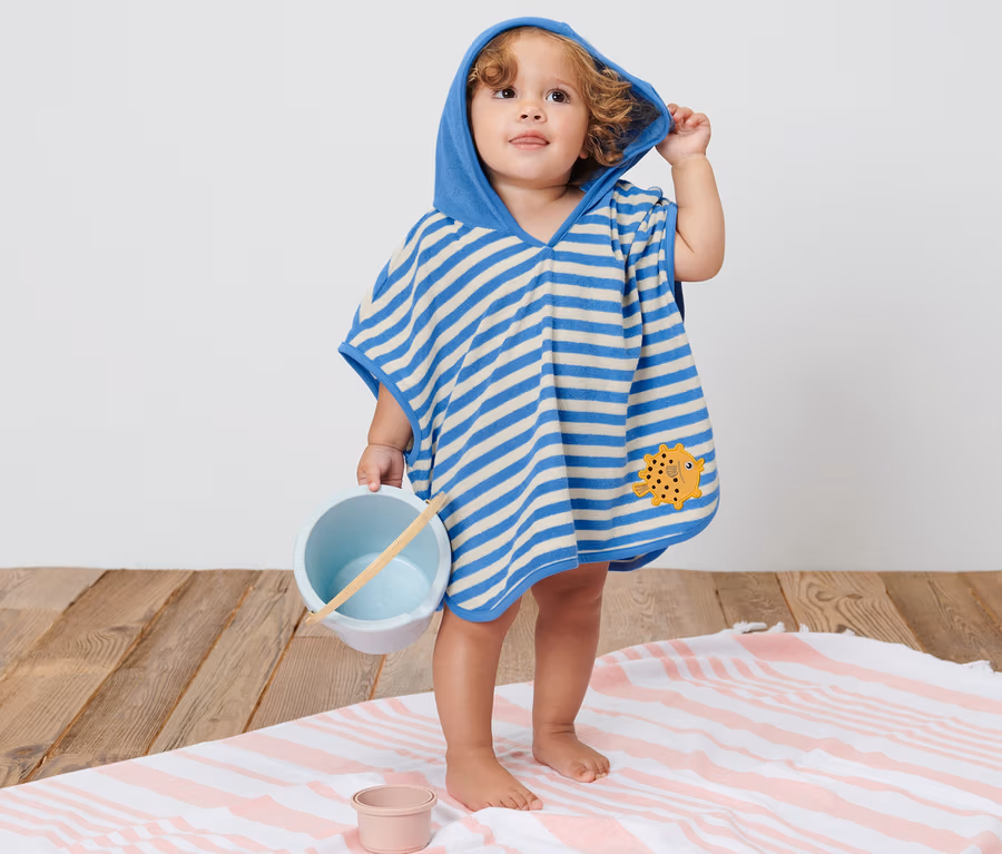 - Dieser Frottierponcho fördert den Anbau nachhaltiger Baumwolle.