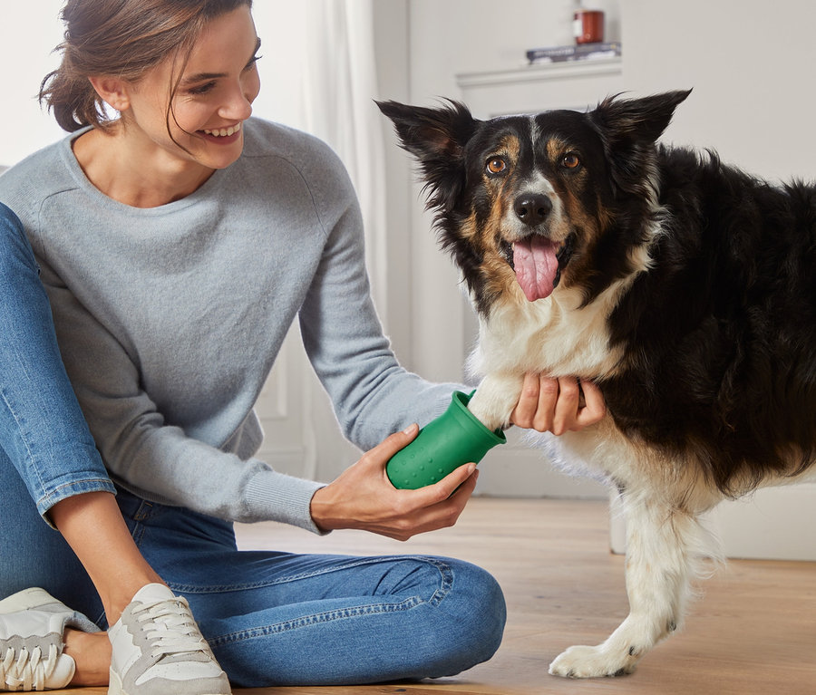 - Pfotenreiniger mit Borsten nach innen, Pflegebürste mit Borsten nach außen