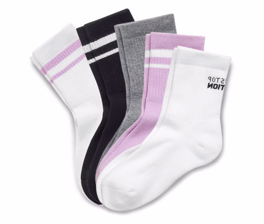 - 1x schwarz mit 2 weißen Ringeln, 1x grau meliert mit schwarzem Schriftzug, 1x lavendel mit 2 weißen Ringeln, 1x weiß mit schwarzem Schriftzug, 1x weiß mit 2 lavendelfarbenen Ringeln