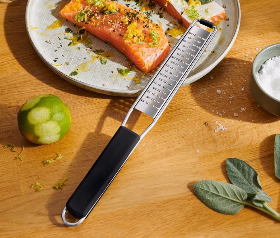 - Edelstahl-Bügel mit rutschhemmender Silikonummantelung – ideal für das Abstützen auf Arbeitsplatten und in Schüsseln