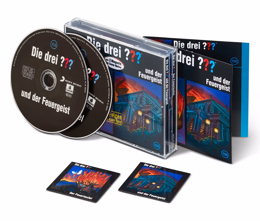 Mit dieser „feurigen“ CD-Box bekommen Sammler, Fans und Neuentdecker der drei Detektive Justus Jonas, Peter Shaw und Bob Andrews mit dem „Feuerteufel“ und dem „Feuergeist“ gleich zwei spannende Hörspiele, die es in dieser Kombination nur bei Tchibo gibt – mit dabei sind die jeweiligen Cover als Kühlschrankmagnete.