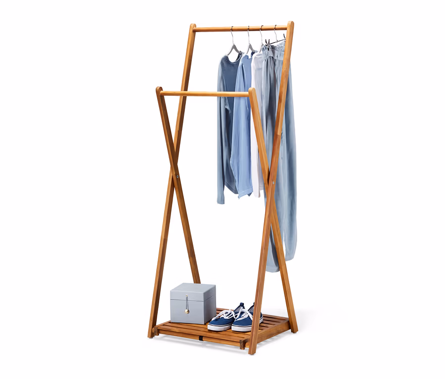 Er ist zusammenklappbar, aus FSC®-zertifiziertem Akazienholz und ausgesprochen standfest: Mit diesem Massivholz-Kleiderständer lassen sich Textilien schonend und immer griffbereit aufbewahren. Die stabile Garderobe bietet auf einem Ablageboden zusätzliche Stellfläche für beispielsweise Schuhe und ist bei Platzmangel im Handumdrehen flach zusammengeklappt.