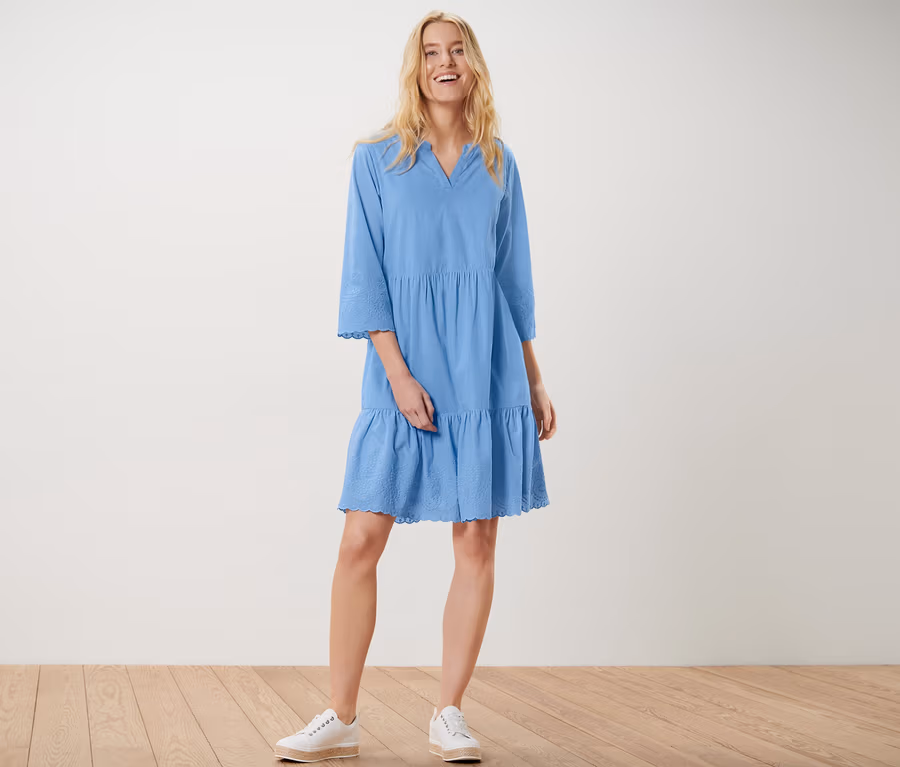 • Ärmelabschluss und Saum mit Stickerei und Wellenkante