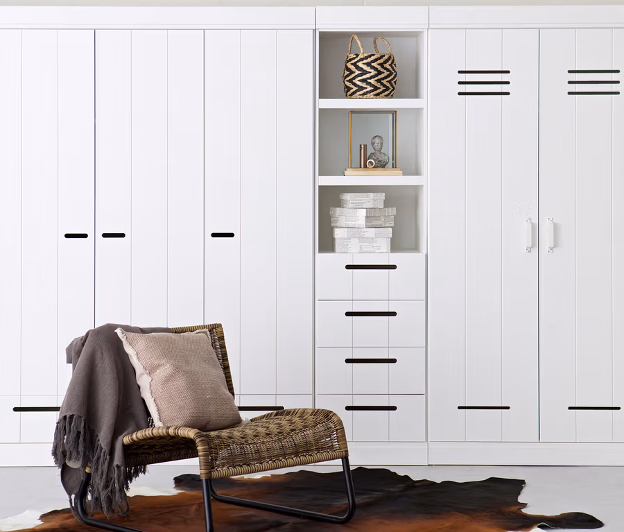 - Robuster, minimalistischer Schrank mit klarer Sockelleiste und Kranz, kombiniert mit Lamellentüren mit Schlitzen