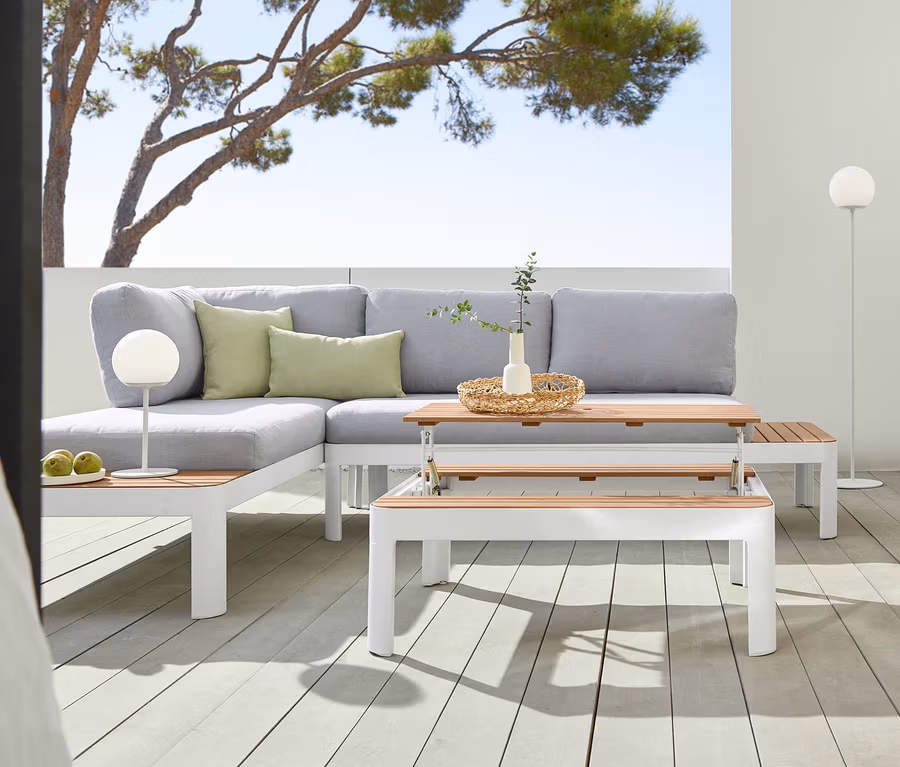Lounge-Ecke mit höhenverstellbarem Couchtisch