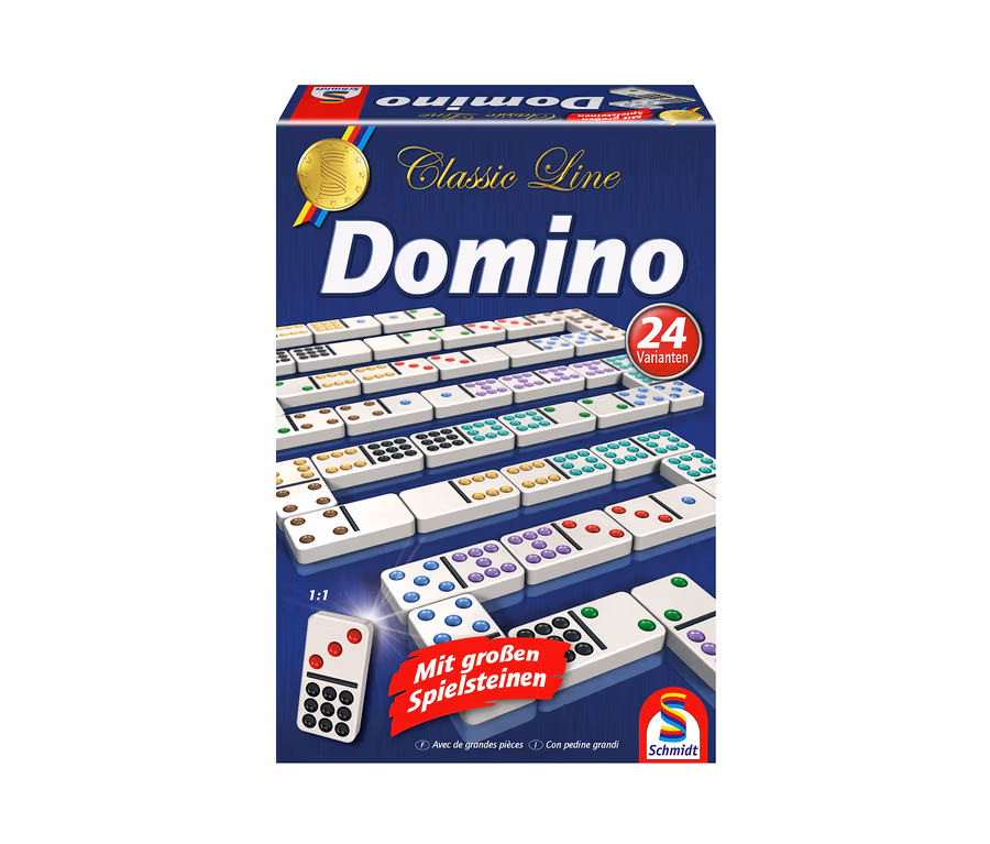 Domino ist ein faszinierendes Spiel, das überall auf der Welt in zahlreichen Varianten gespielt wird. Diese Ausgabe aus dem Hause Schmidt Spiele hat extragroße Spielsteine aus hochwertigem Kunststoff, damit sie auch bei eingeschränkter Motorik gut greifbar und ablegbar sind. Zusätzlich sind die verschiedenen Augenzahlen in unterschiedlichen Farben gehalten, wodurch sie besser zu erkennen sind. Das vielseitige Gesellschaftsspiel kann alleine oder mit bis zu elf Personen gespielt werden. Die Spieldauer ist abhängig von der gewählten Spielvariante, eine Partie dauert in der Regel aber etwa 20 Minuten.