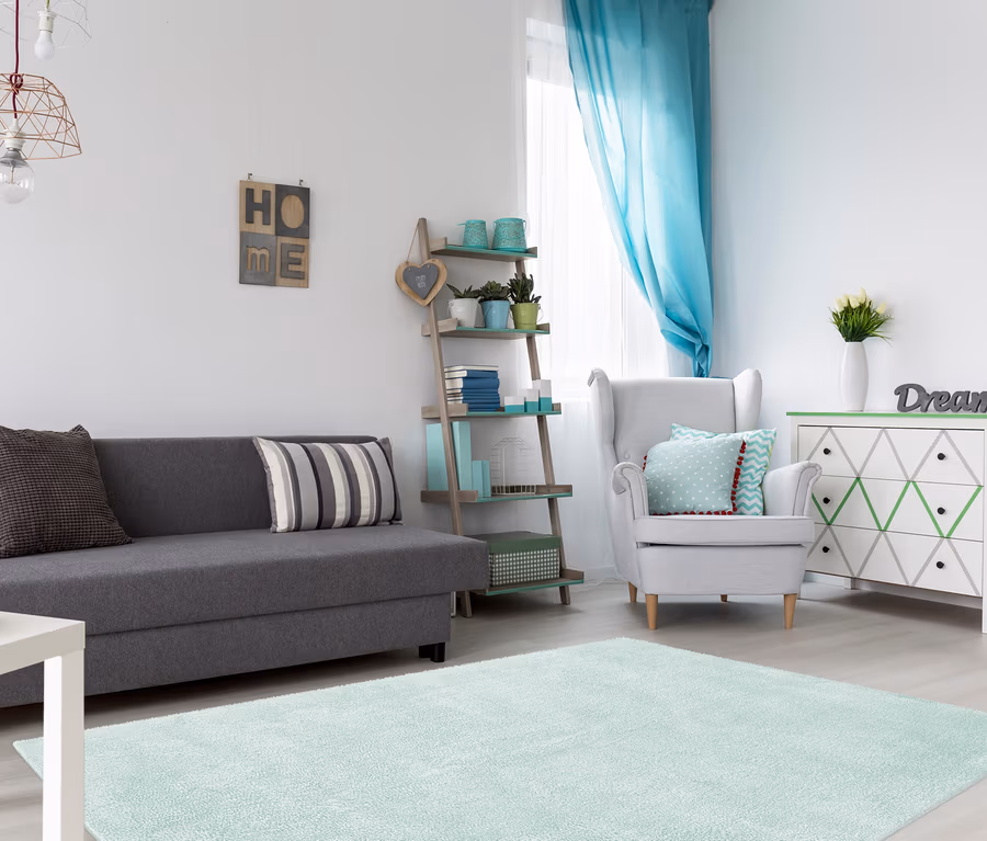 Schöner, flauschiger Teppich.lefiglich am Saum erkennt man Puderblau.bei Tageslicht entspricht die Farbe eher einem kühlen grau.
