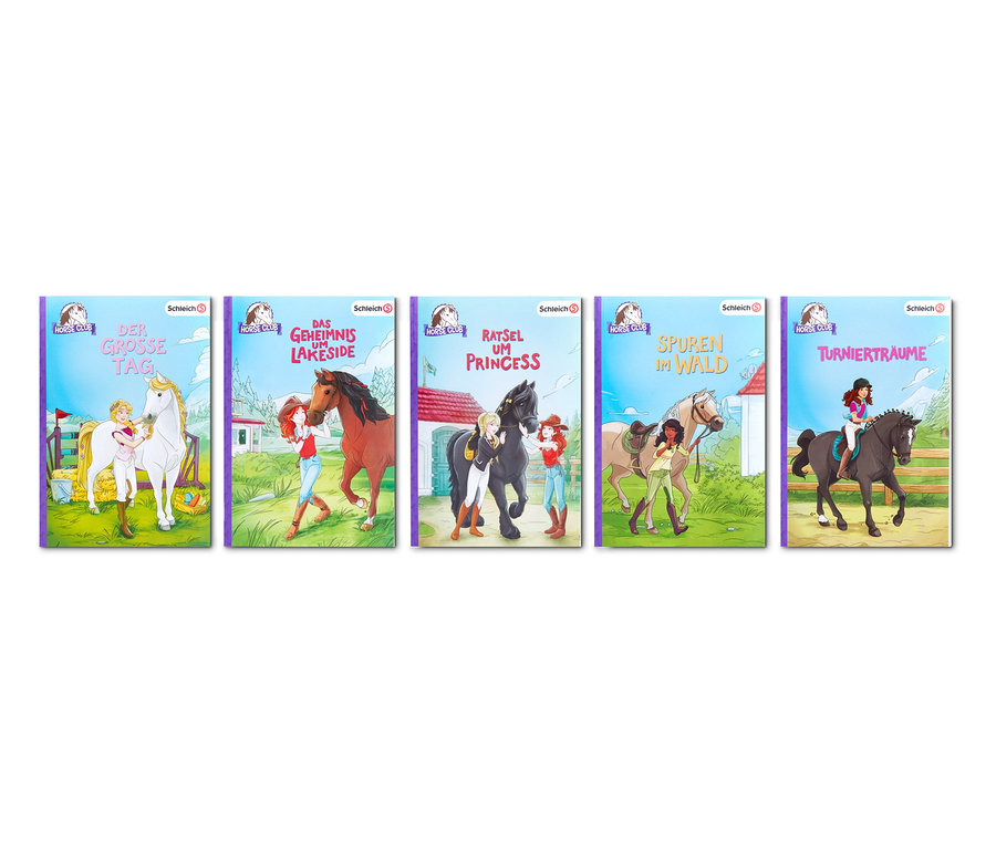 Der »Horse Club« besteht aus vier Freundinnen, die mit ihren Pferden spannende Abenteuer erleben – und in diesem Set gibt es gleich fünf davon im schicken Schuber. Jedes Buch hat 128 Seiten, geeignet sind die Geschichten für Kinder ab acht Jahren. Das Set beinhaltet die Taschenbücher »Das Geheimnis von Lakeside«, »Spuren im Wald«, »Turnierträume«, »Der große Tag« sowie »Rätsel um Princess« und ist in dieser Form exklusiv bei Tchibo erhältlich.