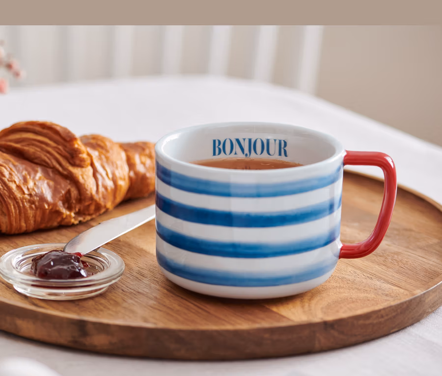 - »Bonjour«-Schriftzug im Becher