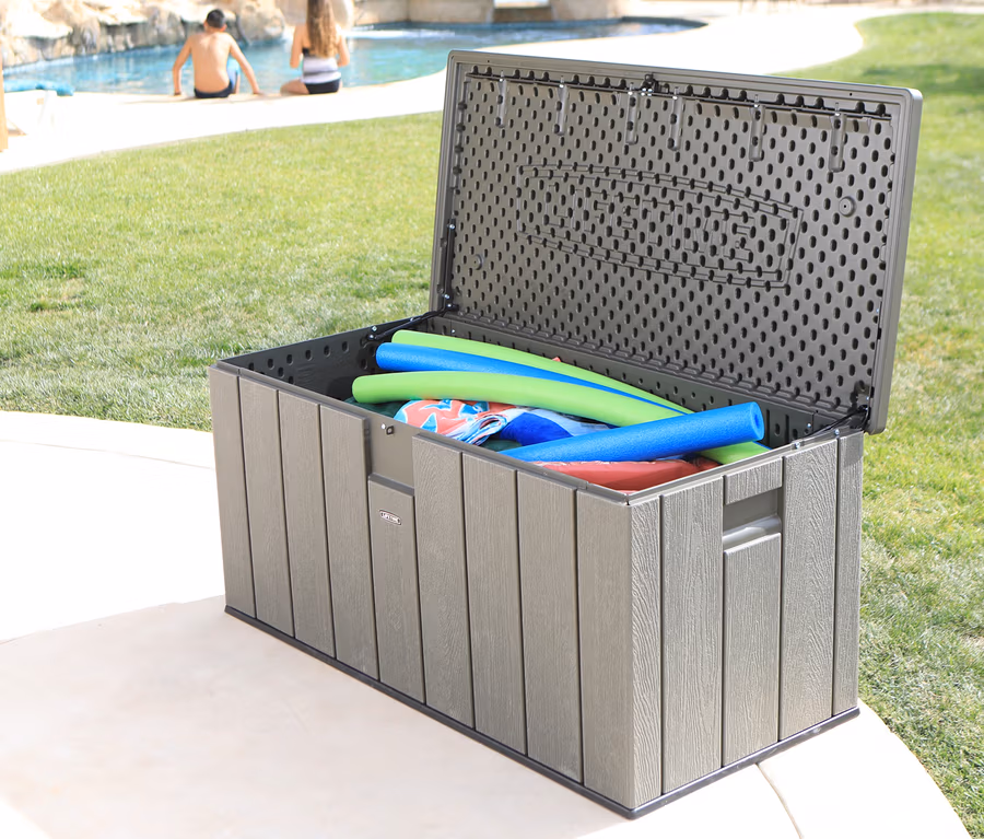 • Für platzsparendes Verräumen von z.B. Auflagen, Kissen, Gartenzubehör und Spielzeug