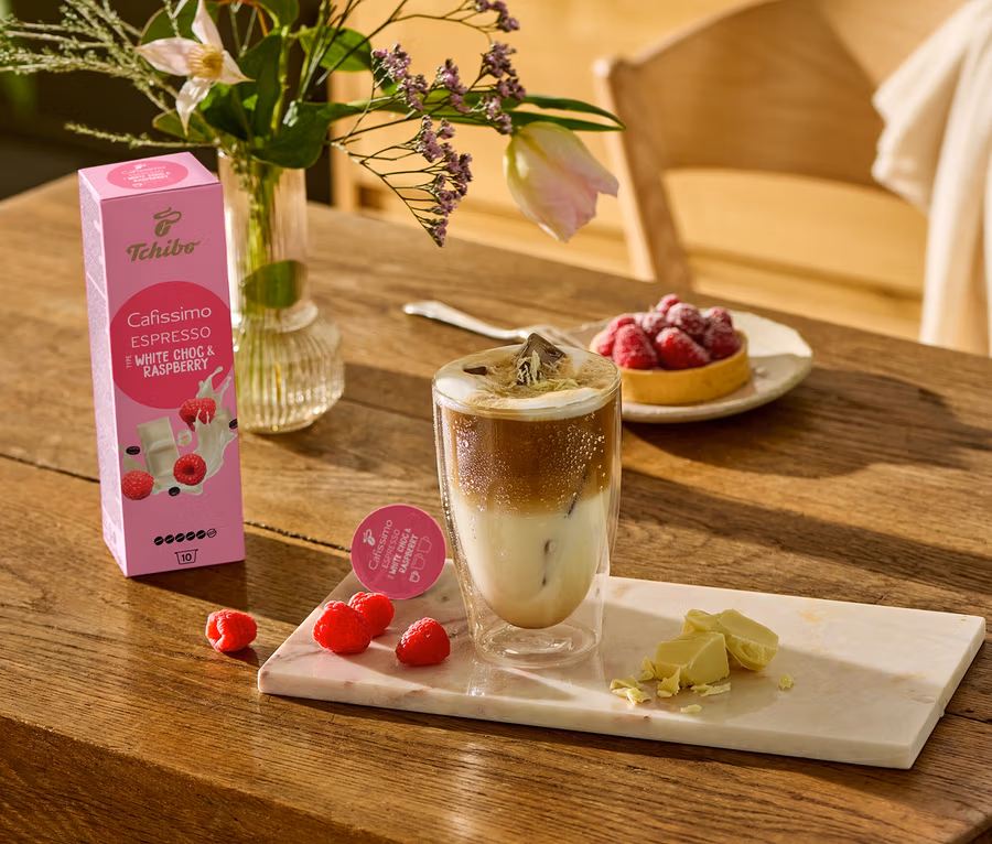 - Ausdrucksstarker Espresso trifft auf den typischen Geschmack von weißer Schokolade & Himbeere
