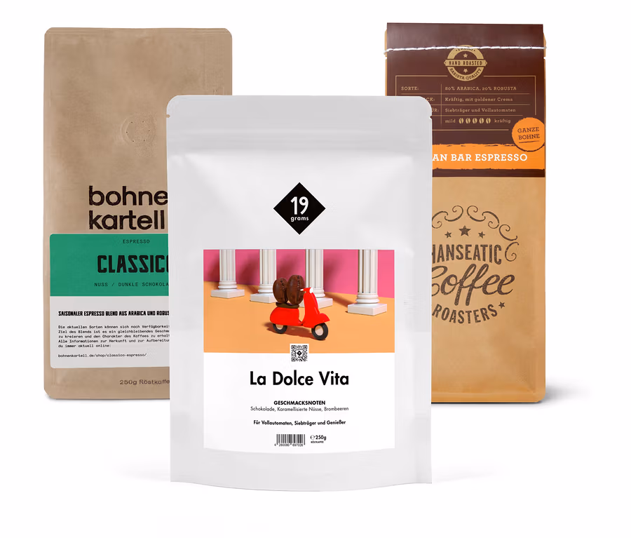 - Set beinhaltet 1x Italian Bar Espresso von Hanseatic, 1x La Dolce Vita von 19grams, 1x Classico Espresso von Bohnenkartell