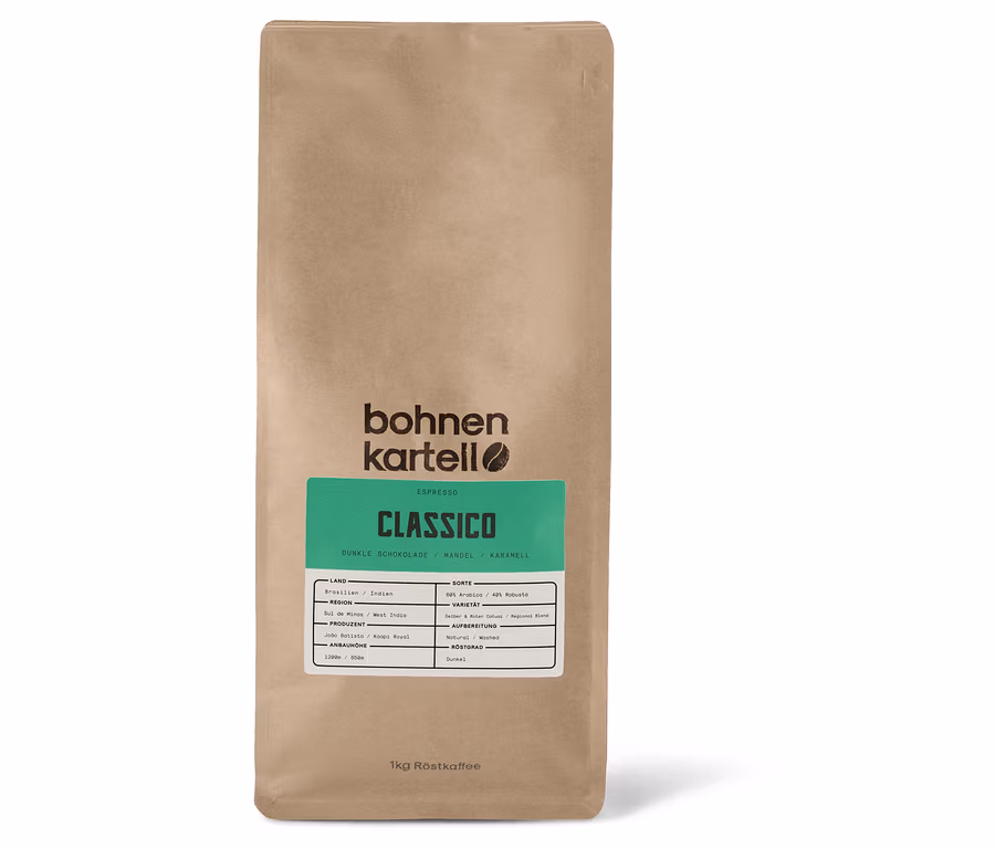 Unser Classico besteht zu 60% aus Arabica-Bohnen aus Brasilien und zu 40% Robusta-Bohnen aus Indien. Das Ergebnis ist ein sehr vollmundiger Espresso mir sehr wenig Säure und viel Crema. Im Geschmack erinnert der Espresso an Nuss und dunkle Schokolade.